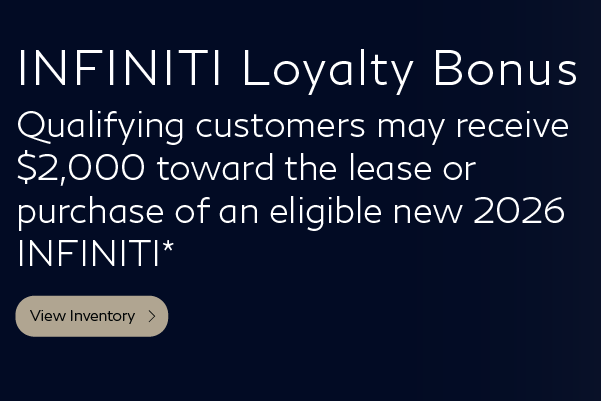 Current 2026 INFINITI vehicle owners or lessees can use the following loyalty cash offers toward the purchase or lease of a new 2026 INFINITI Models: 2,000 loyalty cash if financed as well-qualified customer through INFINITI Financial Services (IFS), or not financed through IFS, or paid in cash. Must show INFINITI retailer the following proof of eligibility at time of new vehicle purchase or lease: (i) customer auto registration or (ii) insurance company letter showing total loss status. Customer must take delivery from new retailer stock. Offer is transferable within eligible customer’s household, with proof of residency. See your local INFINITI retailer for details. Offers ends 04/30/2026.